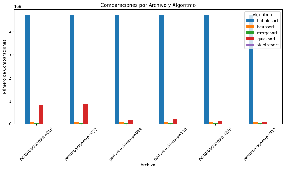 plot_barchart(tabla_comparaciones, "Comparaciones por Archivo y Algoritmo", "Número de Comparaciones")| Algorithm | bubblesort | heapsort | mergesort | quicksort | skiplistsort |