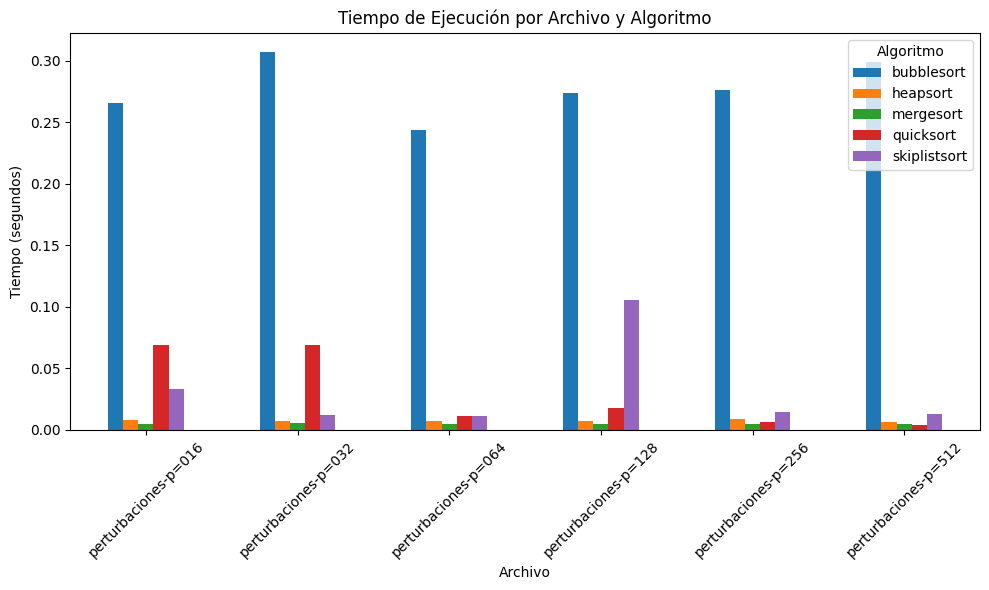 plot_barchart(tabla_tiempos, "Tiempo de Ejecución por Archivo y Algoritmo", "Tiempo (segundos)")| Algorithm | bubblesort | heapsort | mergesort | quicksort | skiplistsort |